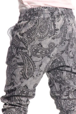 - Drop-crotch, loose through thigh, elastic drawstring waist, elastic cuffs